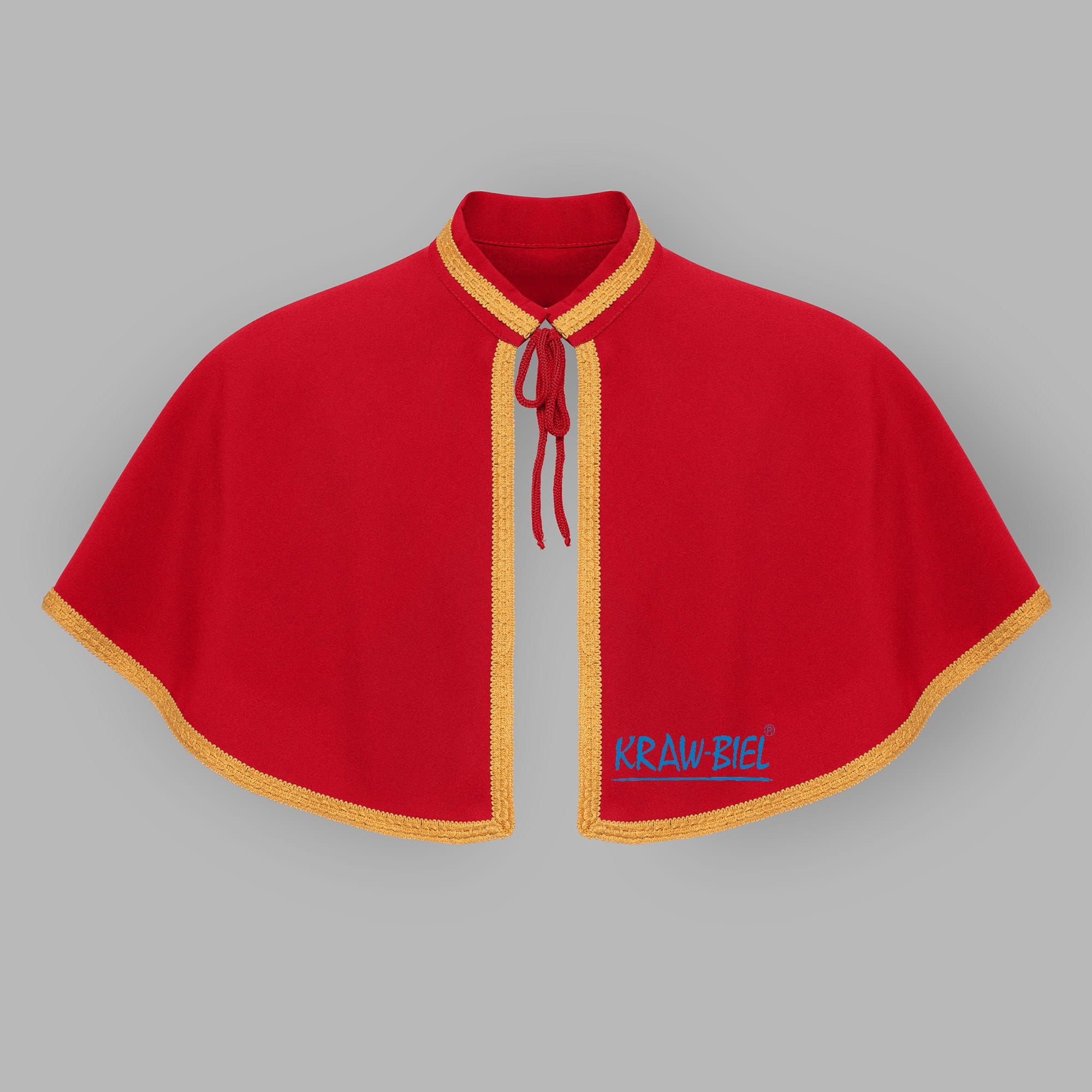 Pelerynka wykończona jest złotą ozdobną taśmą